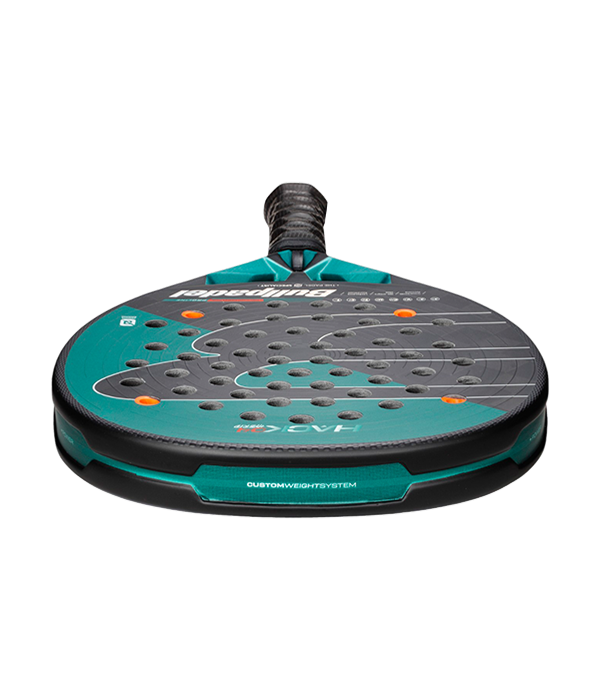 Ahora, los Ease Vibe, dampers personalizables, permiten personalizar el tacto y balance de la pala. También el sistema de pesos CustomWeight constituido por unas placas terminadas en gel con un peso de 3g por unidad, que aportan un peso extra en las zonas determinadas donde se realiza su colocación. La Bullpadel HACK 04 Hybrid incorpora una nueva superficie rugosa 3D con círculos concéntricos, diseñada para optimizar los efectos